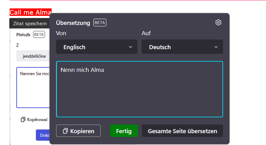 Wenn ich jetzt den Text markiere und eben "Auswahl auf Deutsch übersetzen" wähle, wird als Ausgangssprache deutsch angenommen. Siehe Anhang. Stelle ich auf englisch um wird nicht übersetzt, es erscheint der Dialog: