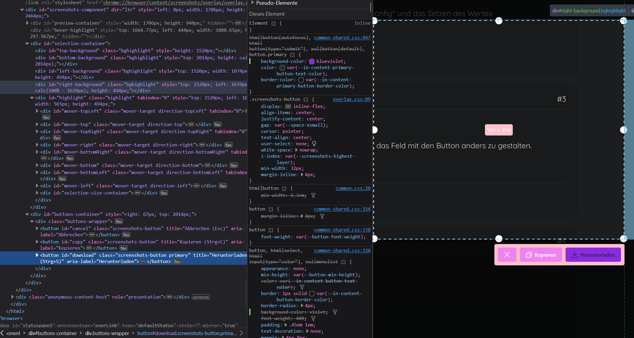 CSS#copy { background: red!important; color: white !important; } #download { background-color: green !important; }die Elemente in den Browser-Werkzeugen anzusprechen