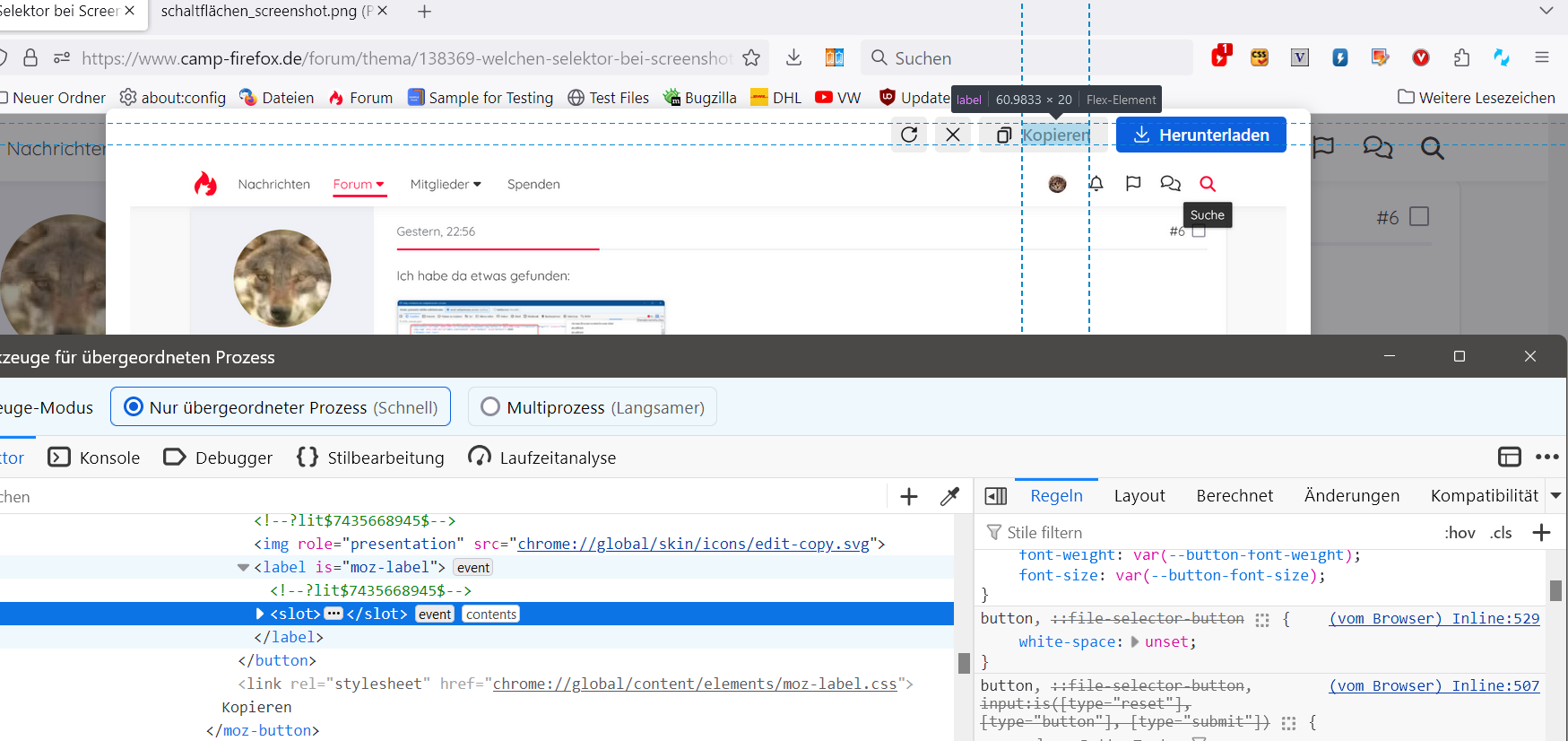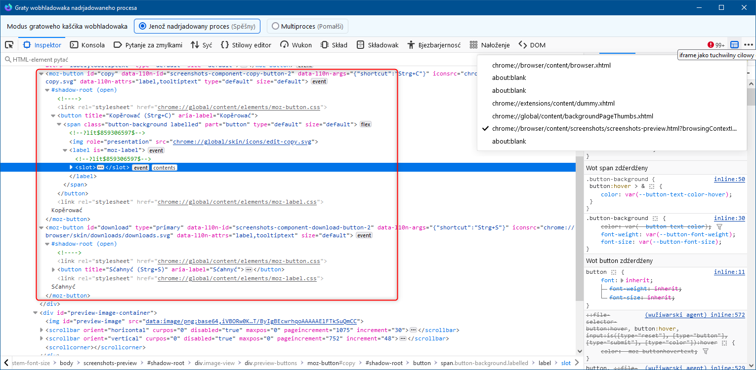 also zumindest das Ansprechen dieser Elemente ließ sich erreichen über "about:config" und das Setzen des Wertes "screenshots.browser.component.preventContentEvents" auf "false".Grüße