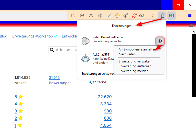 Einfach auf An Symbolleiste anheften klicken und du hast das Symbol in der Symbolleiste und nicht mehr unter dem Erweiterungssymbol.