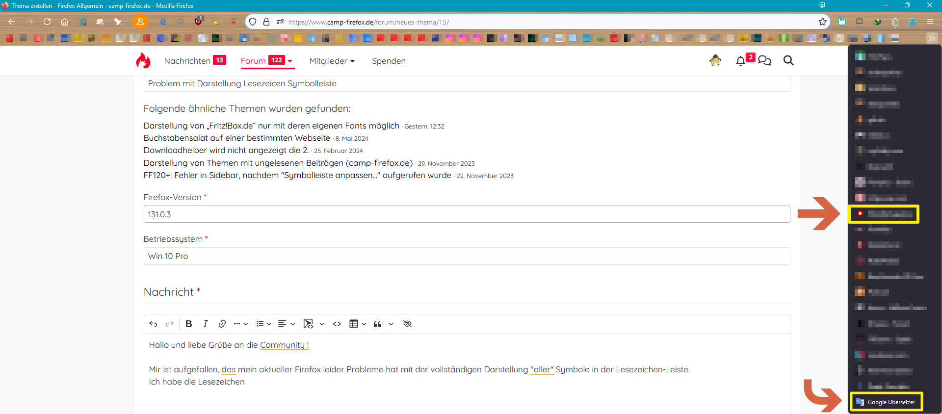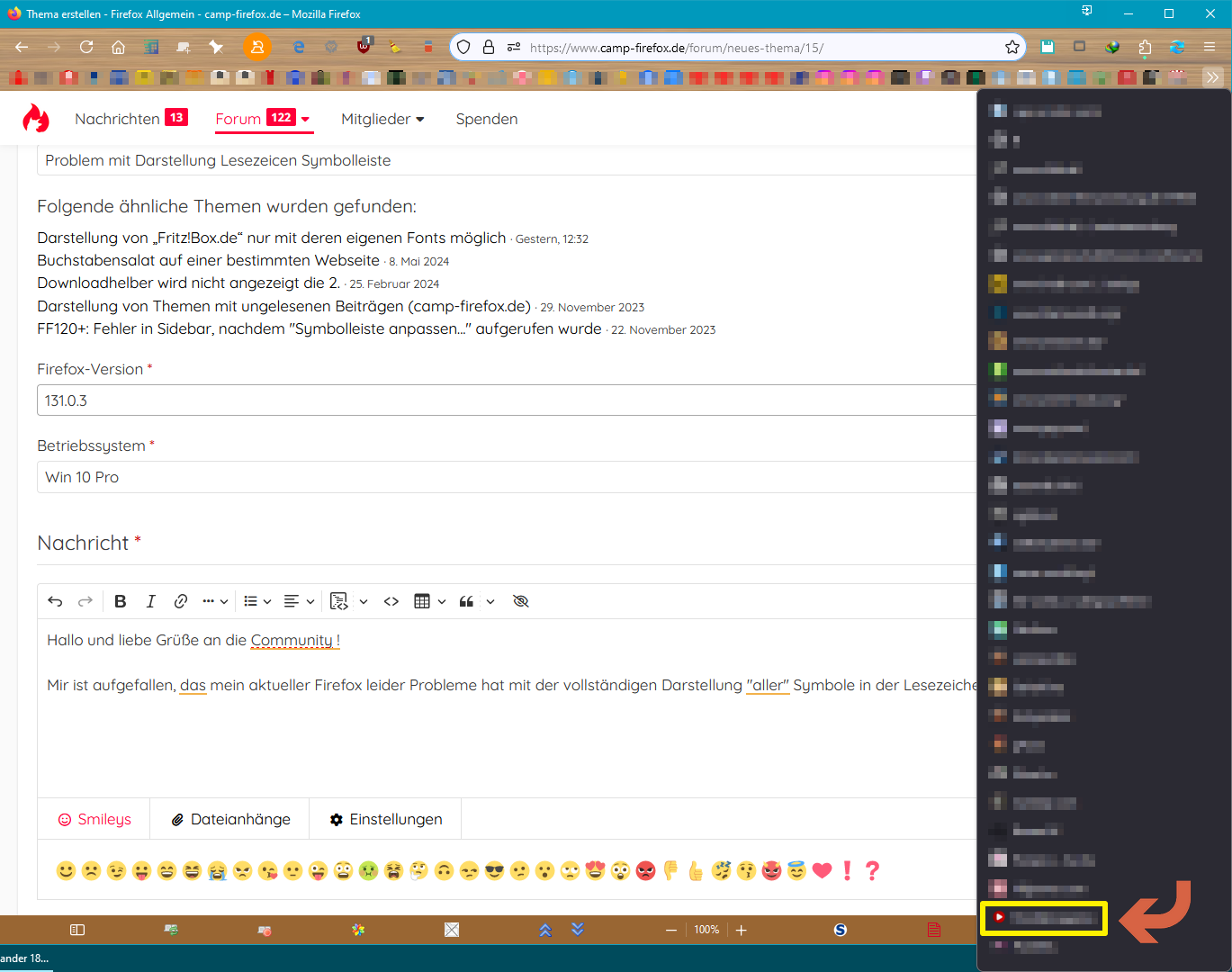 Mir ist aufgefallen, das mein aktueller Firefox leider Probleme hat mit der vollständigen Darstellung "aller" Symbole in der Lesezeichen-Leiste.