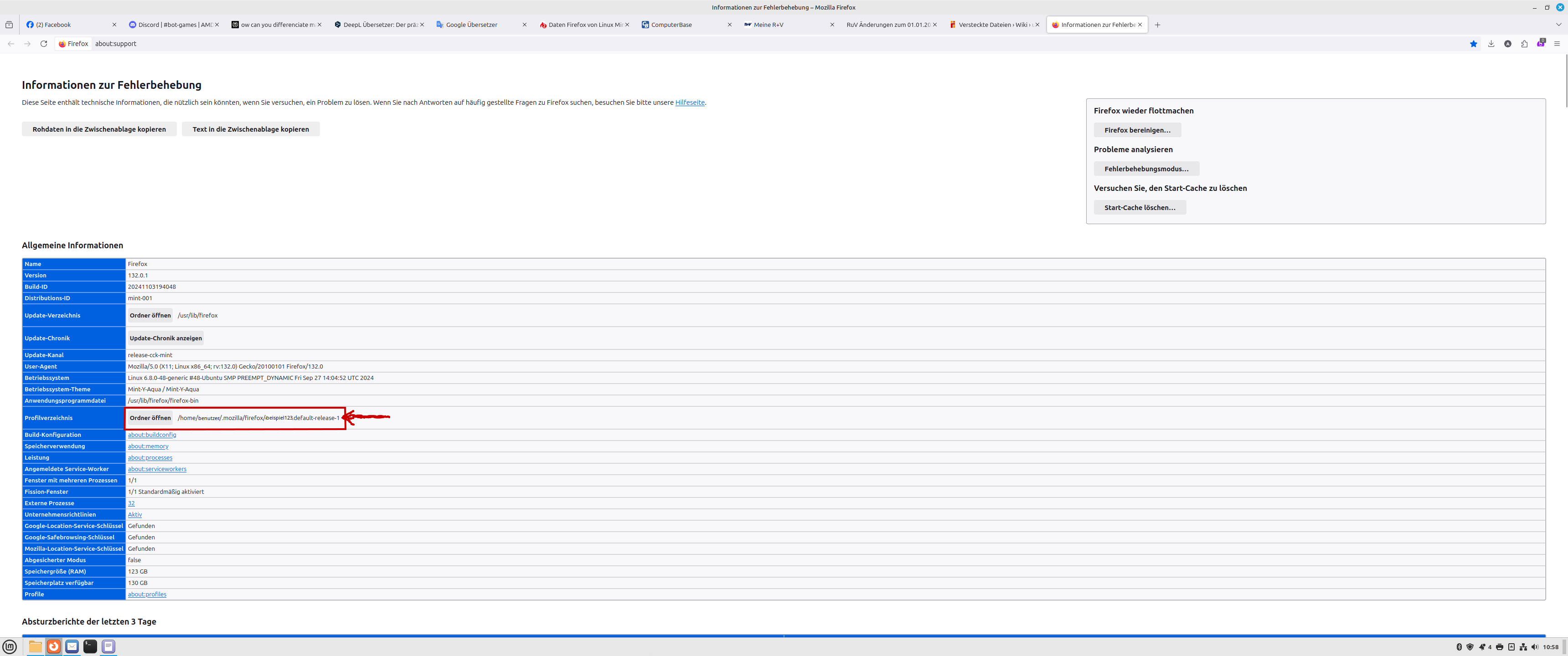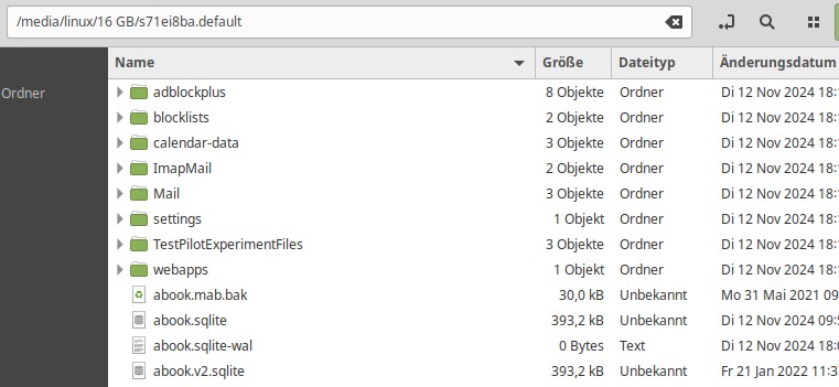 dhb44 Um den Profilordner von Firefox in deinem Home-Ordner zu sehen könnte es notwendig sein das du die Tasten Strg und h gleichzeitig drücken musst um ausgeblendete Ordner in Linux anzuzeigen.
