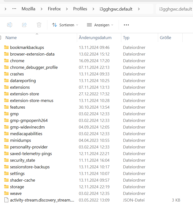 Eine weitere Möglichkeit ist die Funktion Profilordner öffnen zu verwenden in dem Menü mit den 2 Quer-Strichen in der oberen rechten Ecke des Firefox Fenster -> dann auf Hilfe klicken -> dann auf "Weitere Informationen zur Fehlerbehebung".![]()