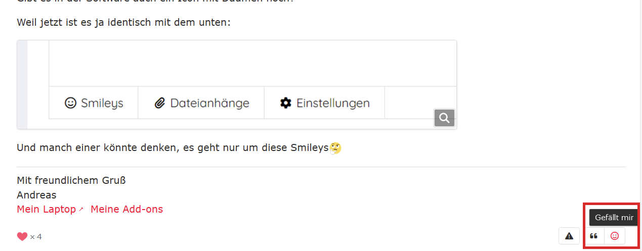 Ab sofort steht in diesem Forum eine „Gefällt mir“-Reaktion in Beiträgen zur Verfügung. Die Reaktion kann auf einzelne Beiträge über das „Smiley“-Symbol am Ende der unteren Symbolleiste von Beiträgen erteilt werden. Sobald mindestens eine Reaktion auf einen Beitrag vergeben worden ist, wird in der entsprechenden Zeile links die Anzahl der vergebenen Reaktionen angezeigt. Per Klick darauf werden alle Nutzer aufgelistet, welche den Beitrag entsprechend bewertet haben. Im Gegensatz zur „Hilfreichsten Antwort“ können Reaktionen für beliebig viele Beiträge pro Thema und nicht nur vom Themenstarter, sondern von jedem vergeben werden.
