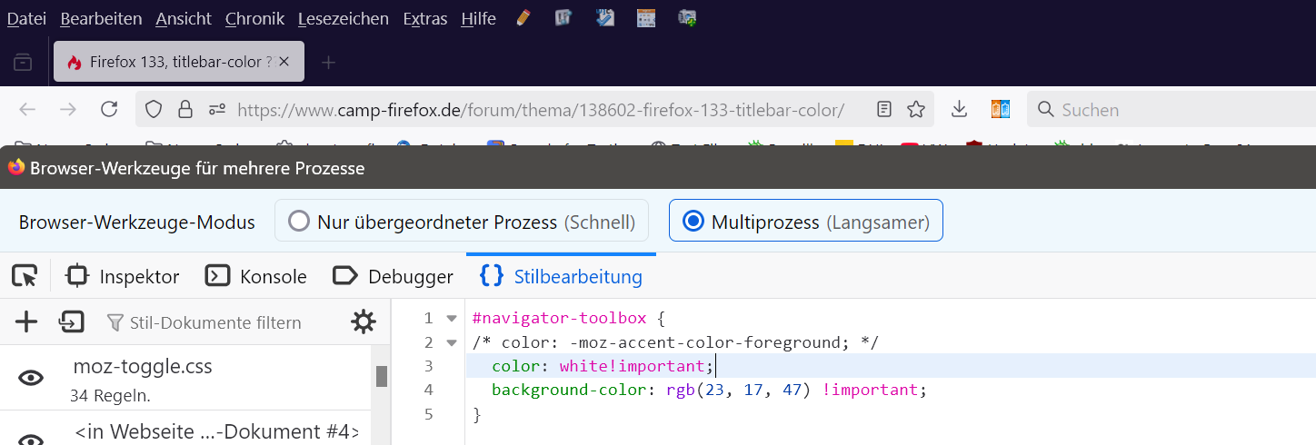 Seit Version 133 ist funktioniert die Zuweisung der Farbe an die Titlebar mittels titlebar-color nicht mehr. Gibt es da für Versionen 133+ schon eine Lösung, wie man die Titlebar nach seinen wünschen wieder 'einfärben' kann?