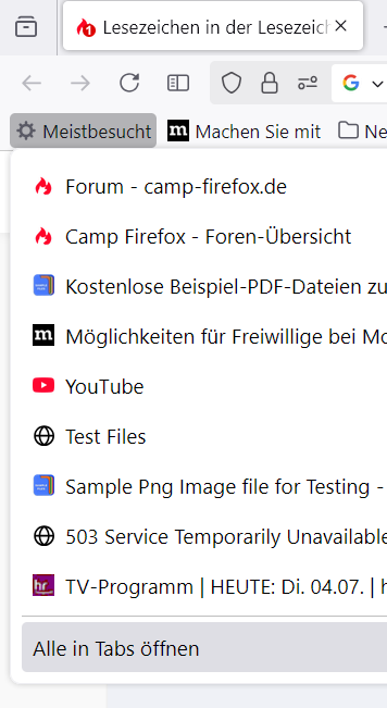 Alle anderen Lesezeichen in dieser Leiste werden mit Icon angezeigt. Auch im Lesezeichen Menü wird dieses Lesezeichen nur als Text dargestellt. Ich habe dieses Zeichen gelöscht und wieder neu erstellt. Aber es steht wieder ohne Icon da.