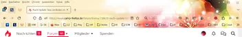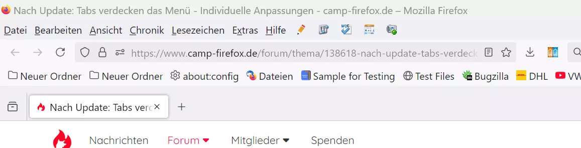 Aktuell sieht mein Firefox so aus wie in Bild eins. Auch wenn nur ein angepinnter Tab offen ist, der ja keinen Platz wegnimmt, kann ich keine Option in der Menüleiste anklicken, komme also nicht mehr in die selten benutzten Lesezeichen oder in die Chronik. Und da oben kann ich auch die Tabs nicht gebrauchen.