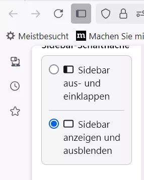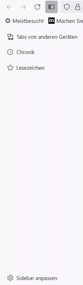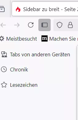 • Um die Sidebar entweder schmal zu machen oder auszublenden, muss man allerdings nichts über about:config verstellen. Das ist eine Sidebar-Einstellung beziehungsweise erfolgt das Ein-/Ausklappen respektive Ein-/Ausblenden über den Sidebar-Button in der Navigationssymbolleiste.