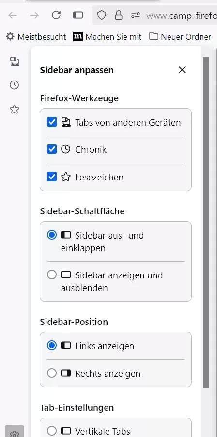 • In Firefox 133 gibt es keine sichtbare Einstellung für die neue Seitenleiste. Die neue Seitenleiste wurde in Firefox 133 für einen kleinen Teil der Nutzer standardmäßig aktiviert. In der Zwischenzeit hatte der Themenstarter die Seitenleiste über about:config deaktiviert (Beitrag #19) und damit besteht das Problem auch nicht mehr.