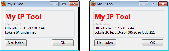 Seit Windows 7 Ultimate 32 Bit und dem Fuchs 3.5.x bekomme ich durch My IP Tool bei der lokalen IP nur noch sowas hier: