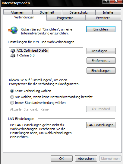 Man sollte allerdings unter Internet Einstellungen mal die Verbindungseinstellungen überprüfen. Es gibt ja nix, was es nix gibt... 8)