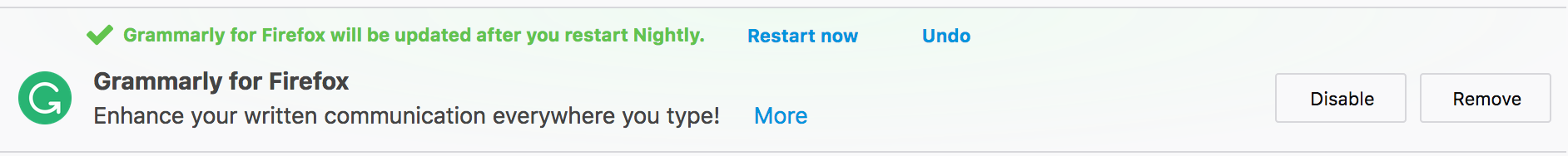 Grammarly meldet es brauche einen Neustart um das Update durchführen zu können LOLDu hast es durch das Ticket sicher schon mitbekommen, aber für's Protokoll: es liegt kein Firefox-Fehler vor, weil die Erweiterung selbst, aus welchen Gründen auch immer, ihr Verhalten so implementiert hat, dass ein Update erst nach einem Browser-Neustart angewendet wird. Es ist also das gewollte Verhalten von Grammarly, WebExtensions haben diese Möglichkeit.