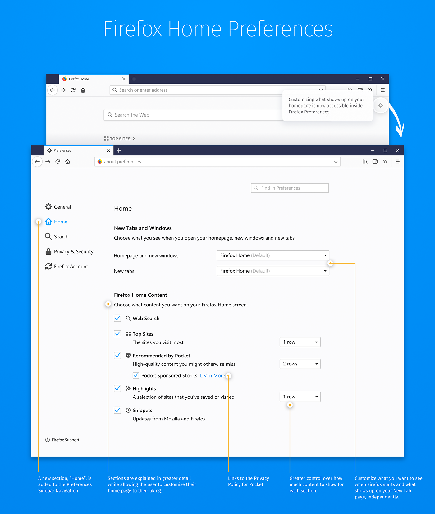 Wenn wir schon beim Activity Stream sind, noch für Firefox 60 geplant, hier die geplanten neuen Einstellungen - die Einstellungen werden alle in die Haupt-Einstellungs-Seite integriert: