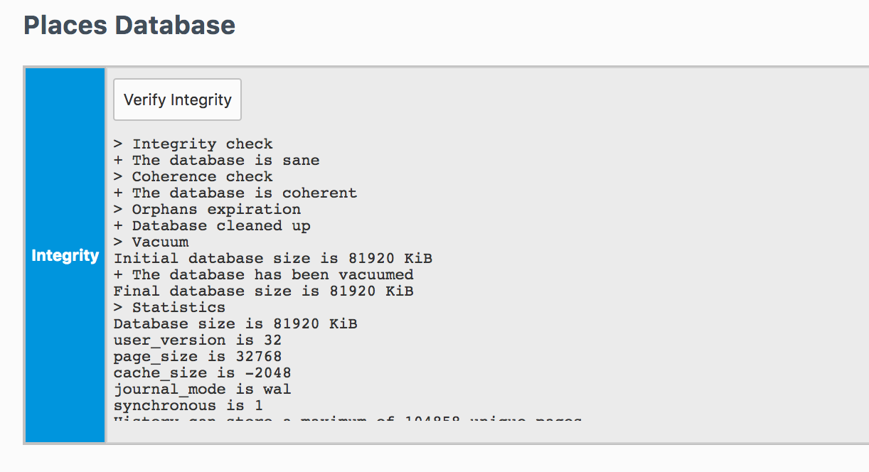 Neu ab Firefox 49 in about:support. Keine Ahnung, ob das in irgendeiner Weise hilft, wenn jemand irgendwelche Probleme in Zusammenhang mit der Places-Datenbank hat, wäre aber vielleicht einen Versuch wert bei zukünftigen Support-Anfragen, dann findet man es heraus.