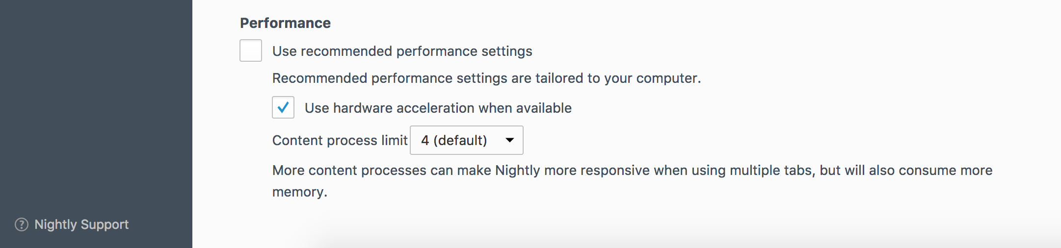 • Für Support-Anfragen relevant: die Einstellung für die Hardwarebeschleunigung befindet sich ab Firefox 55 an dieser Stelle, ganz unten im Reiter Allgemein. Die übergeordnete Checkbox für die empfohlenen Einstellungen muss zunächst deaktiviert werden (darunter fallen ab Firefox 57 weitere Einstellungen).