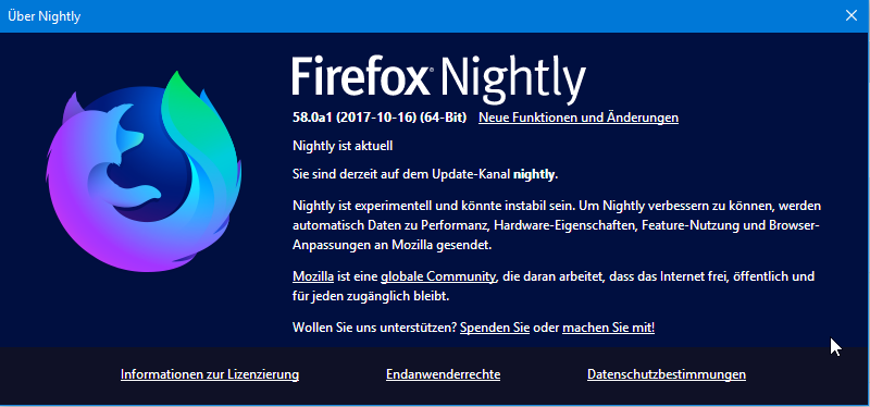 • Zuhause auf Englisch, auf Arbeit auf Deutsch - daher kann ich auch nichts dazu sagen, ob sie zeitgleich erscheinen. :D Wobei sich das ja vermutlich leicht über archive.mozilla.org prüfen lässt… Der langfristige Plan ist sowieso, dass es nur noch einen einzigen Firefox-Build gibt und Firefox dann komplett auf Sprachpakete mit Mozillas neuem Lokalisierungs-Framework l20n setzt. Das erlaubt dann auch einen Wechsel der Firefox-Sprache ohne Browser-Neustart. Auch Builds, die von Haus aus mehrere Sprachen beinhalten, sind dann möglich. Aber das ist noch Zukunft. Auf jeden Fall arbeitet Mozilla daran.