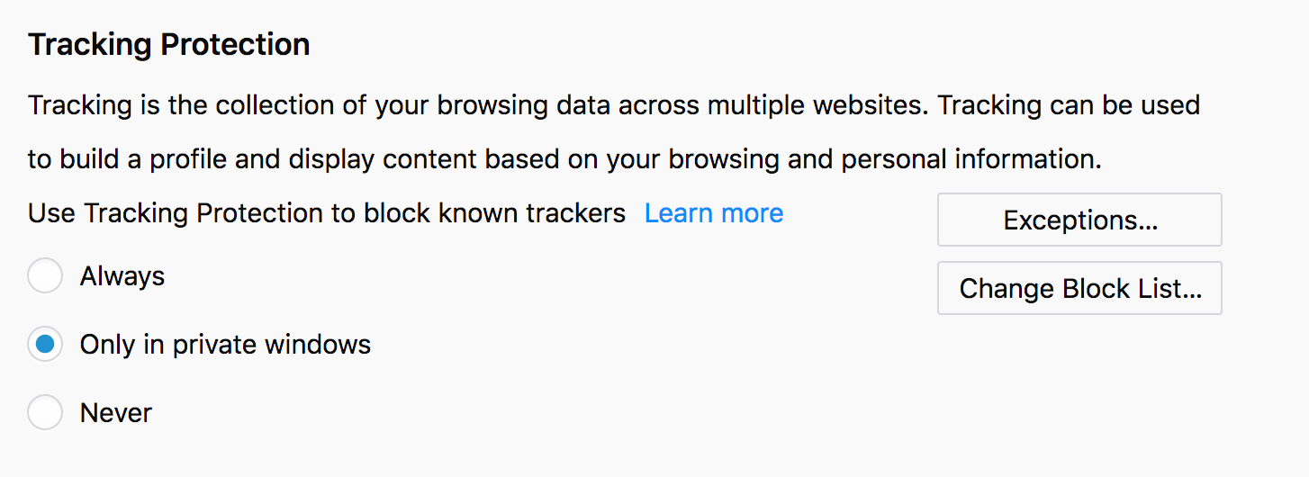 Firefox 57 hat noch eine Neuerung in letzter Minute erhalten (noch nicht enthalten in Beta 14, aber wird im RC 1 drin sein). Der Tracking-Schutz kann nun auch außerhalb von privaten Fenstern über die Firefox-Einstellungen aktiviert werden.