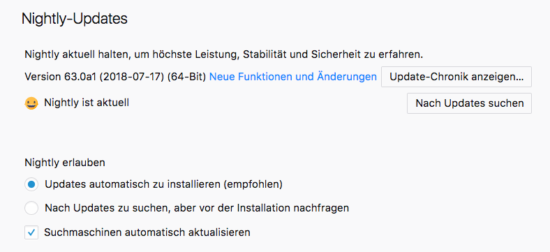 Die automatische Installation von Updates kann immer noch über die Firefox-Einstellungen deaktiviert werden, aber die Option, nach Updates nicht einmal suchen zu lassen, wurde entfernt. Auch die dazugehörige Einstellung app.update.enabled in about:config existiert nicht länger. Das geht nur noch über die Policy Engine (wobei meine Erweiterung helfen kann: https://addons.mozilla.org/de/firefox/add…licy-generator/; auch wenn da steht, dass das nur mit Firefox ESR geht, das geht ab Firefox 62 auch im Mainstream-Firefox).