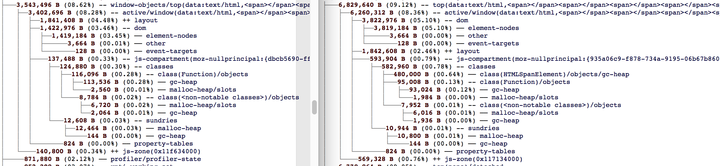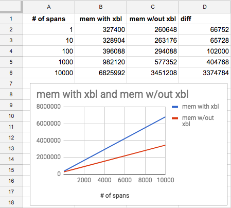 Das Bild zeigt den RAM-Verbrauch für 10.000 span-Elemente, links mit XBL im Content-Prozess, rechts ohne XBL im Content-Prozess: 3,4 MB im Gegensatz zu vorher 6,2 MB.[attachment=1]Bildschirmfoto 2018-11-23 um 09.34.21.png[/attachment]