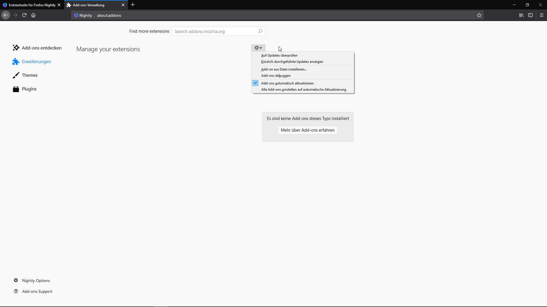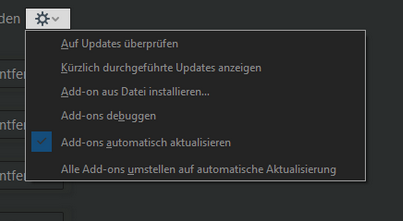 Wenn "Add-ons automatisch aktualisieren" aktiviert ist, heißt der letzte Eintrag "Alle Add-ons umstellen auf automatische Aktualisierung" und wenn "Add-ons automatisch aktualisieren" nicht aktiviert ist, heißt der letzte Eintrag "Alle Add-ons umstellen auf manuelle Aktualisierung". Die Funktion ist in beiden Fällen die Gleiche: Die entsprechende Einstellung für alle Add-ons wird auf "Standard" zurückgestellt. Da könnte auch einfach immer stehen "Alle Add-ons umstellen auf die Standard-Einstellung". Der Text reflektiert also ganz einfach, was der Standard ist.