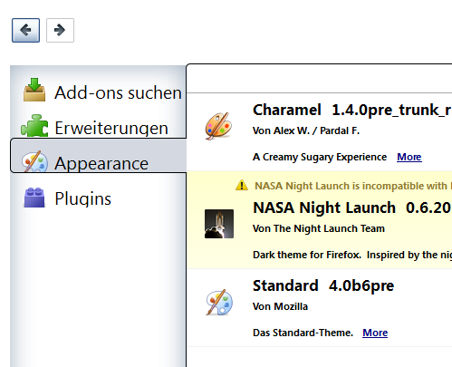 Nochmal der Add-On-Manager. Der Themesbereich wurde umbenannt in Appearance.