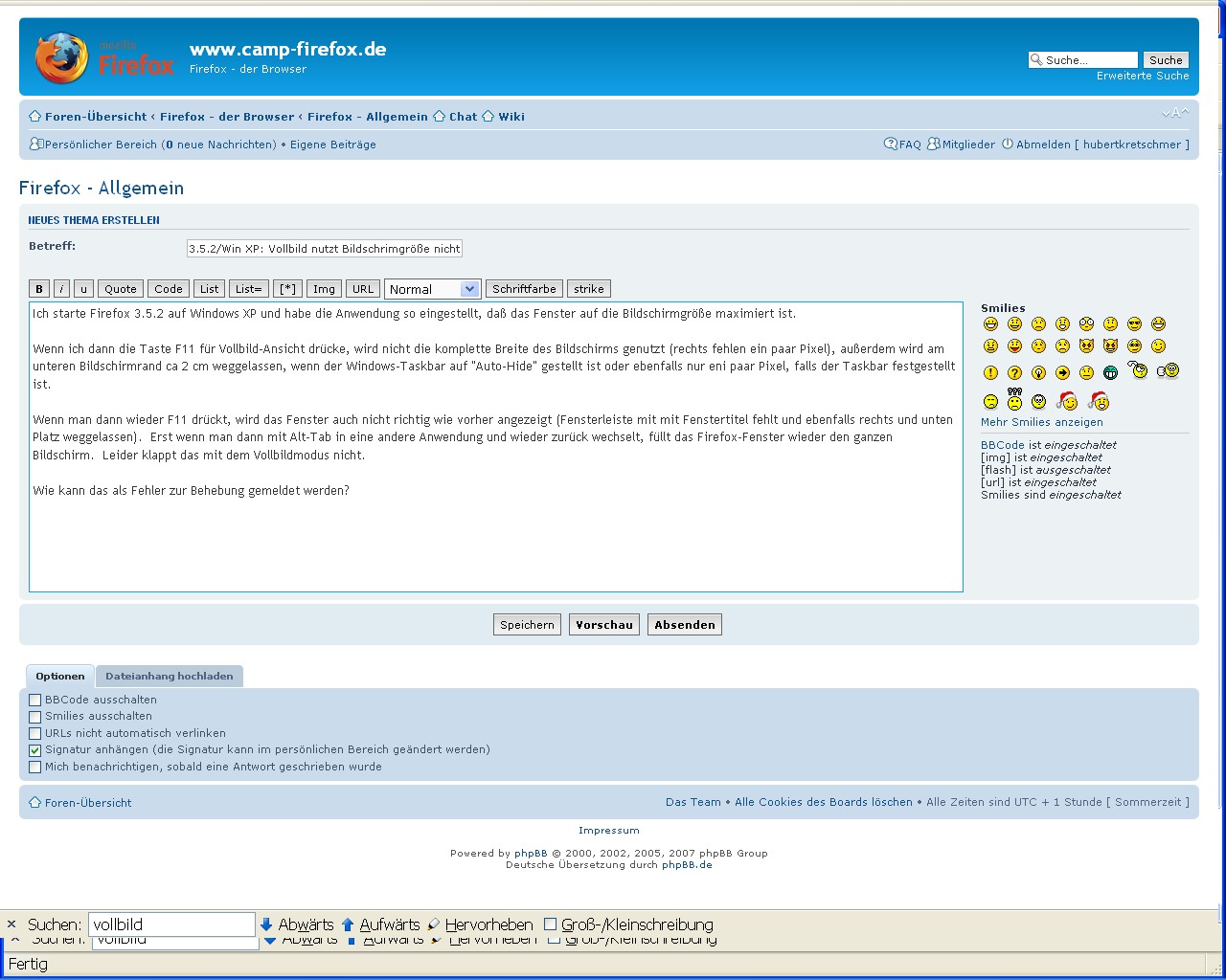 Ich starte Firefox 3.5.2 auf Windows XP und habe die Anwendung so eingestellt, daß das Fenster auf die Bildschirmgröße maximiert ist.