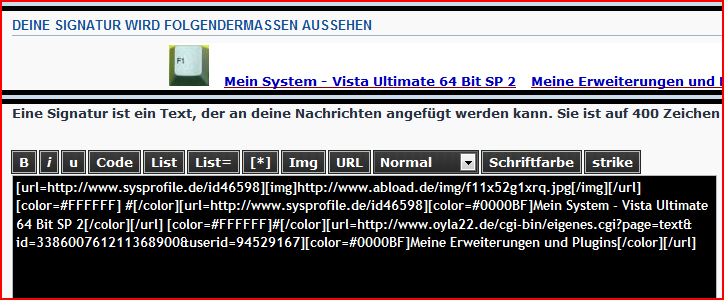 Könntest du deine Signatur noch so anpassen, dass die F1 Taste links neben den anderen beiden Links steht und zwischen den Links keine Leerzeile ist? Sonst nimmt die Signatur unverhältnismäßig viel Platz im Vergleich zum Postingtext ein.
