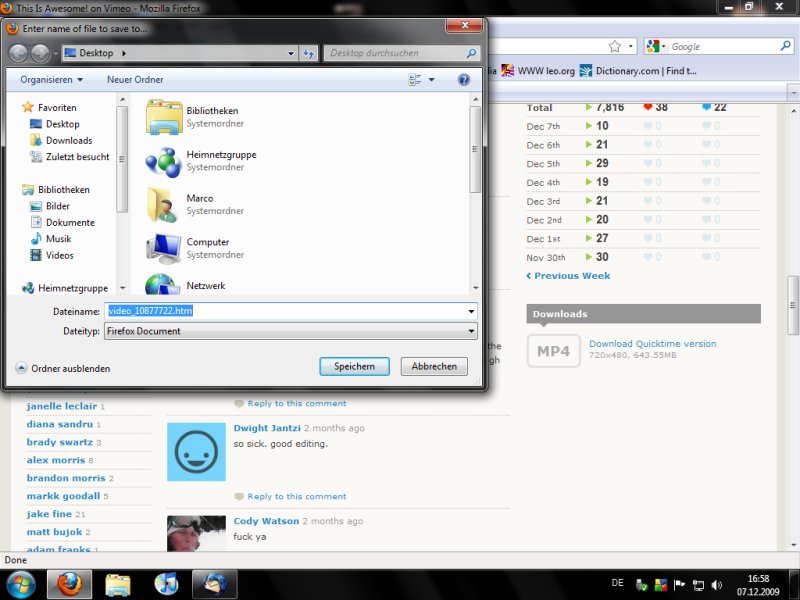 ich habe seit einiger zeit ein problem bei firefox. wenn ich einen videolink direkt speichern will, zeigt mir firefox immer nur eine .htm datei an (bsp: ich habe versucht ein video im .mp4 format auf vimeo runterzuladen und die datei, die ich erhalte wenn ich "rechtsklick - link speichern unter mache" ist wie folgt: video_10877722.htm). wenn ich das gleiche mit dem ie 8 probiere funktioniert es einwandfrei. könnt ihr mir sagen wo das problem liegt?