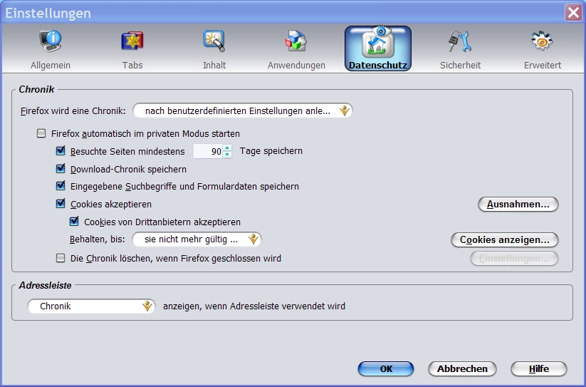 • Abelsoft ist jetzt weg. Aber wenn ich in denEinstellungen eingebe "Chronik anlegen", klicke ich das Fenster nur schnell mal weg und hol es wieder her. Was sehen wir: Aus Chronik anlegen ist benutzerdefiniert geworden. Hatte ich aber gar nicht eingestellt. Wer weiß Rat?[attachment=1]sss.jpg[/attachment] Meine Einstellungen zu Beginn.[attachment=1]sss.jpg[/attachment] die geänderten Einstellungen.