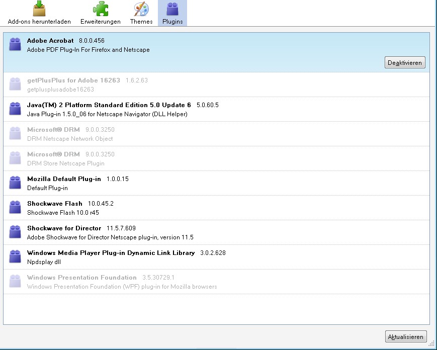also ich habe winxp home und sp2 dazu und plugins sind folgende installiert siehe bild erweiterung habe ich nur fox lingo ein übersetzungstool in version 2.6.1. Sicherheitsprogramm habe ich nur antivir drauf die aktuelle version. Neues Profil und Safe Mode brachte nichts. -
