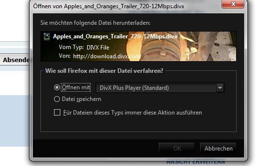 Falls ja, dann ist der MIME-TYP video/divx. Schließe zunächst Blockiermöglichkeiten deines konfigurierten Browserprofils aus und teste den Aufruf dieser Seite mit einem cleanen Profil (also 0 Extension eingebunden, keine Einstellungsveränderung).PS. Was ganz genau passiert, wenn du folgenden Direkt-Link anwählst?