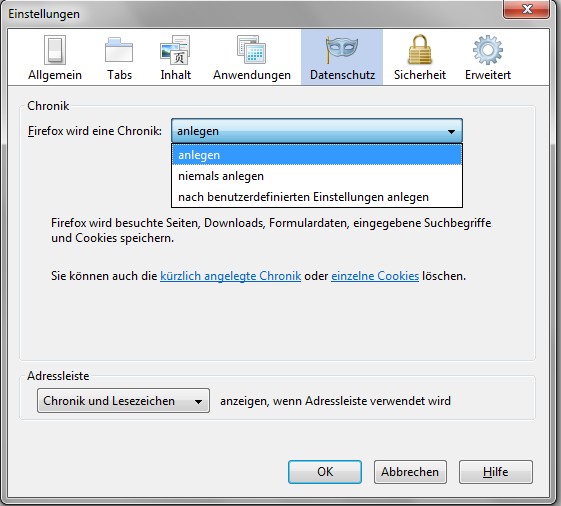 Und nun stelle entsprechend deinen Vorstellungen ein.Möchtest du zu History, Download- History, Cookies und ggf. dem Löschen von Gebrauchsdaten eigene Einstellungen haben /wählen - oder nicht. Soll bei Eingabe (und entspr. vorgenannten Einstellungen) bei ein Eingabe eines Strings (Such- Strings) in der URL-Bar History + Bookmarks oder nur 1-nes von Beiden oder Nichts angezeigt werden?