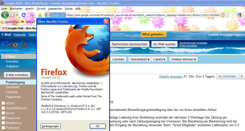 Es liegt somit am Programm. Da es mit anderen Browsern locker möglich ist, die E-Mail schreiben-Eingabemaske unter googlemail aufzurufen, liegt das Problem m.E. bei der neuen FF-Version. Unter 3.6.8. gibt es kein derartiges Problem, dafür hat man aber die supergefährlichen (;-) Sicherheitslücken. Möglicherweise gibt es einen Zusammenhang mit der Zeitumstellung am 31.10. Oder ist das nur eine zufällige Korrelation?