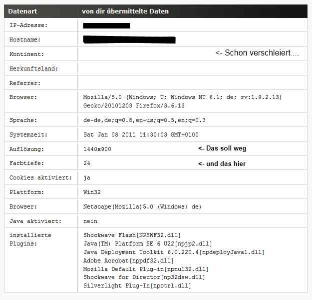 • Mal ganz doof gefragt: was hast du denn dagegen, dass die wissen, welche Auflösung du benutzt (außer dem Vorteil, dass die Seitenanzeige somit deinen Bildschirmeinstellungen angepasst und insgesamt optimiert werden könnte)? Ist ja nicht so, dass man aus der Auflösung Rückschlüsse auf deine Bankverbindung ziehen könnte...