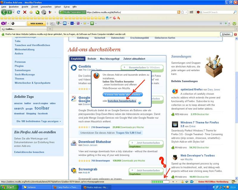seitdem ich meinen FireFox-Browser aktualisiert habe (auf FireFox 3.6.13), kann ich bei FireFox keine Add-ons mehr laden, ohne dass dort ein Fenster aufgeht, in dem ich aufgefordert werde, "laden Sie Firefox herunter", und "lernen Sie mehr über FireFox", danach ein Zusatz "oder trotzdem herunterladen". Letzteres ist anklickbar, aber es erfolgt danach kein Download. -