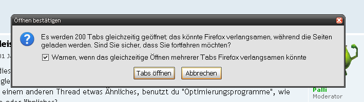 Bei mir war dat mal so: Firefox gestartet/ 1 Lesezeichen angeklickt, es erschien das Fenster (siehe Pallis Scrennshot),allerdings nicht 200, habe weniger Bookmarks.