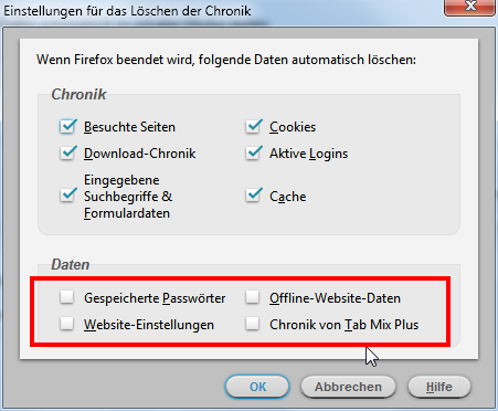 Ich lasse "Besuchte Seiten", die "Download-Chronik" und den "Cache" löschen. Formulardaten sollten eigentlich erhalten bleiben. Von den oberflächlichen Einstellungen sollte eigentlich alles korrekt eingestellt sein. Ich bin nicht mehr ganz sicher, hatte das vor ein paar Jahren aber glaube ich schon mal. Ich weiß aber nicht mehr, wie ich das damals behoben habe. Da fing der Firefox nämlich auch auf einmal an Daten nicht mehr zu speichern, nur war da das System schon länger in Betrieb. Das jetzige Setup von Windows ist noch quasi neu und der Firefox hat von Anfang an dieses Problem.