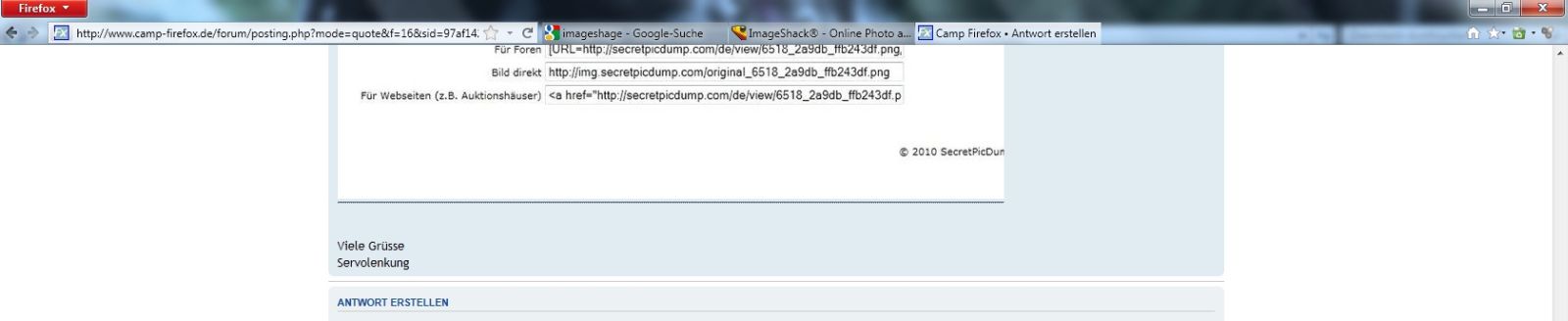 Nö, du klickst beim Antwort erstellen am unteren Rand auf Dateianhang hochladen, wählst das Bild per Durchsuchen auf deinem Computer aus und klickst auf Datei hinzufügen. Anschließend klickst du dann auf Im Beitrag anzeigen. Setze vorher die Einfügemarke der Maus an die Stelle, an der das Bild erscheinen soll.