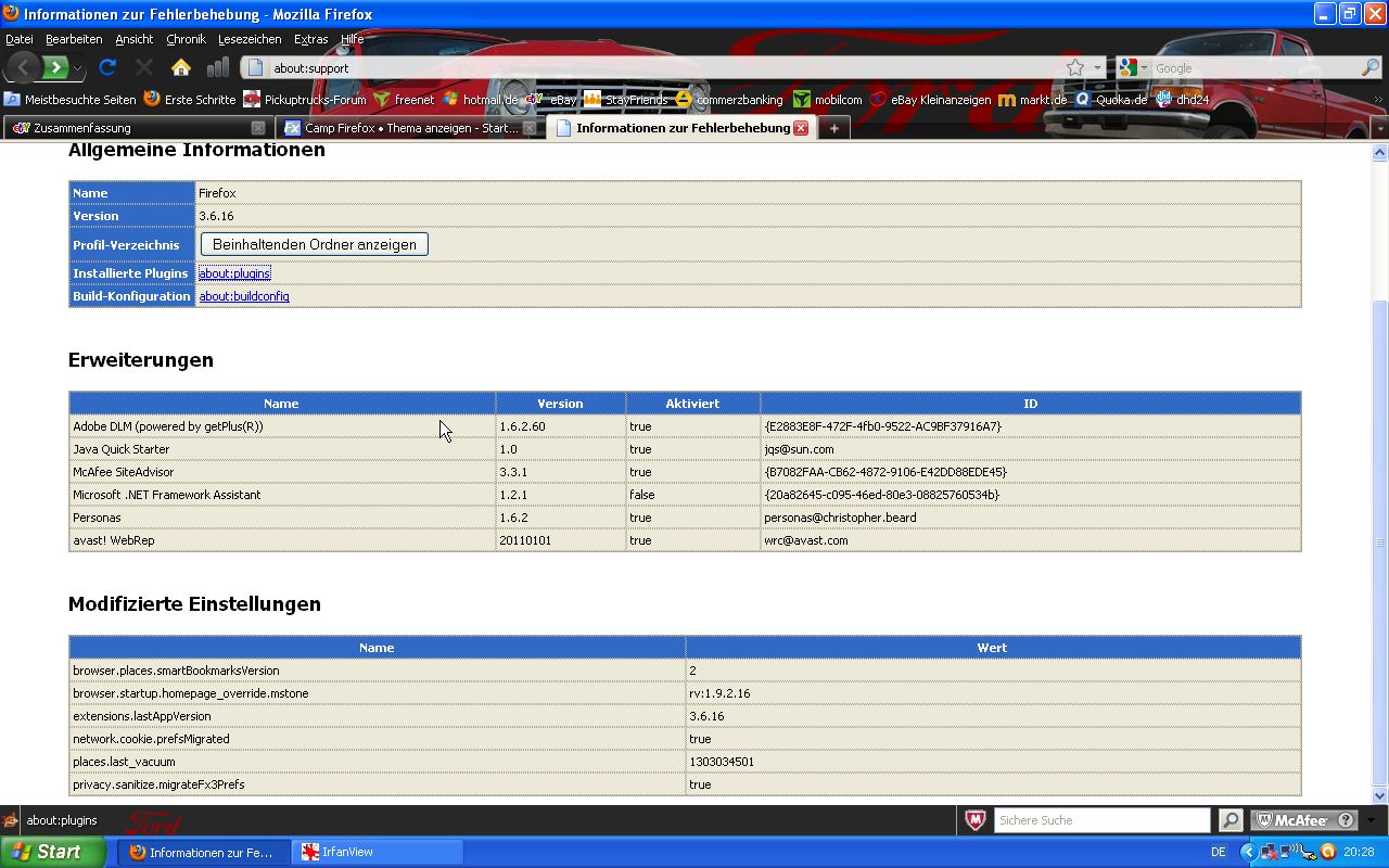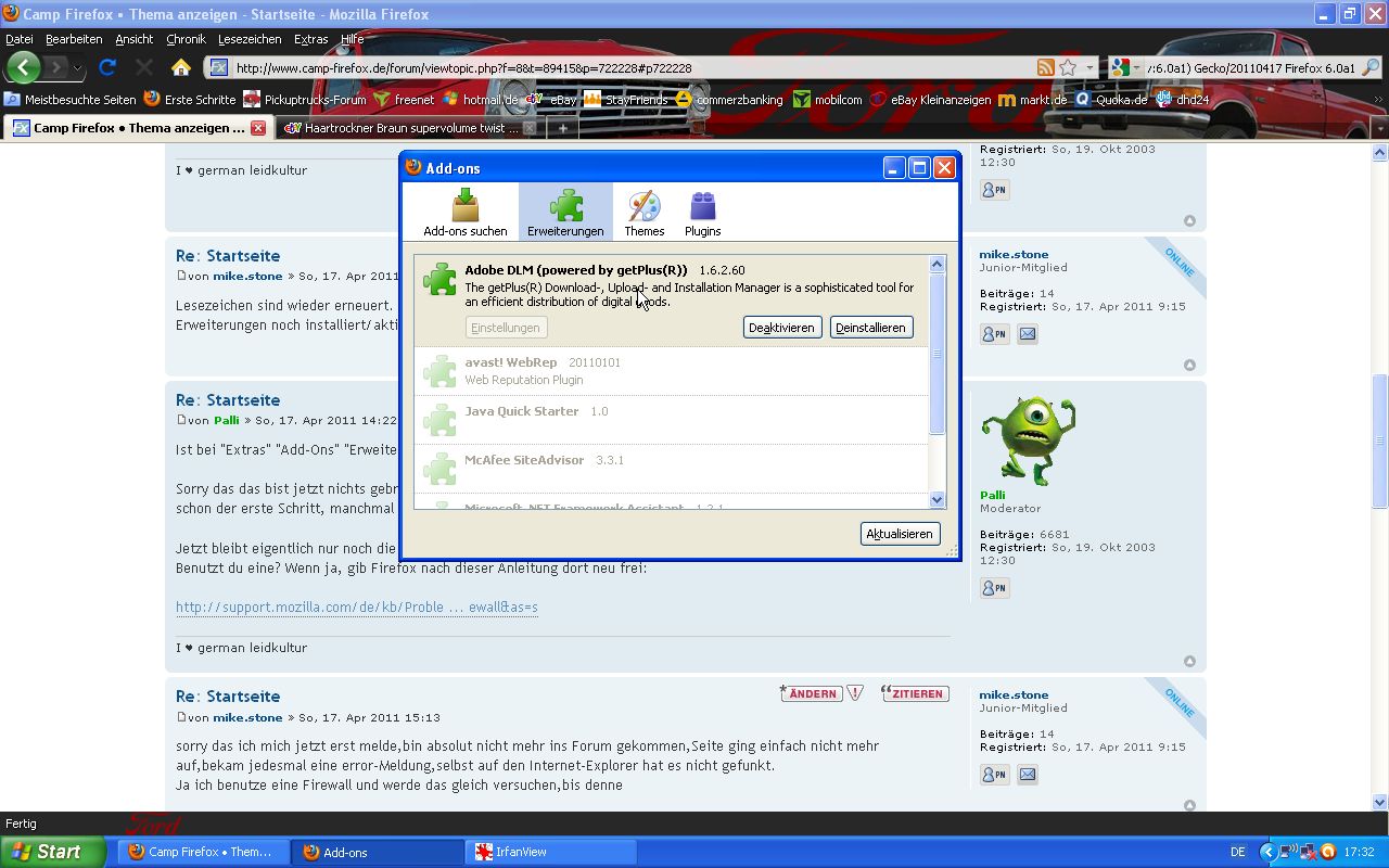 Quicktime ist veraltet. Aktuell ist 7.6.9. Adobe DLM kannst du deinstallieren, braucht man nur um Adobeprodukte herunterzuladen. Personas ist im Firefox integriert, auch diese Erweiterung deinstallieren. Du nutzt das Default-Theme?