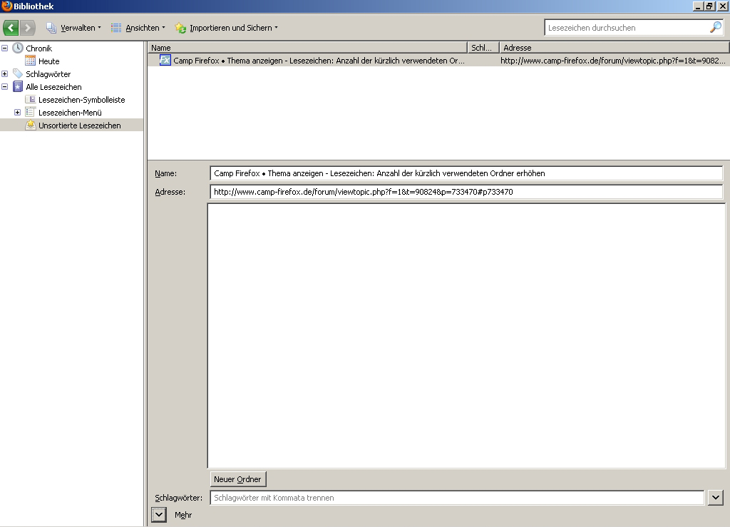 Weiterhin würde ich gern wissen, ob man den Standard "Unsortierte Lesezeichen" verändern kann, etwa in "Lesezeichen-Menü". Ich denke, diese Frage wurde an verschiedenen Stellen schon öfter gestellt, eine Lösung konnte ich bisher aber nicht finden.