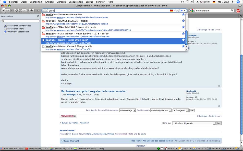 hab seit einiger zeit das problem das in der firefox version 3.6.17 für mac os version 10.4.11 die lesezeichen alle von einen auf den anderen moment verschwunden sind.