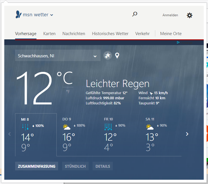 Hier ein Screenshot vom MSN-Wetter in Schwachhausen: