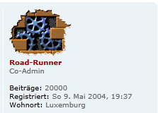 Auch von mir: Danke Road-Runner für Deine 20.000 Beiträge,vor allen Dingen mit welcher Ruhe Du hier bei der Sache bist ! :wink: