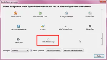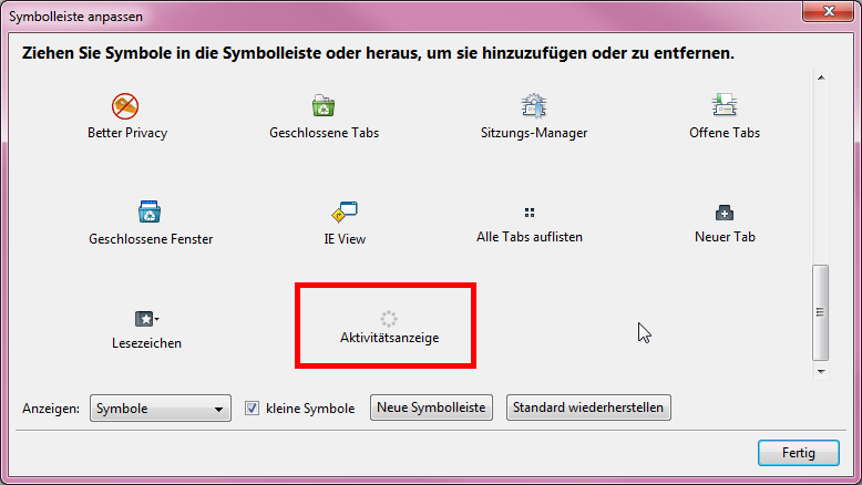 Bei "Symbolleiste anpassen" sind bei mir diverse andere Möglichkeiten (Downloads,Chronik usw.) als Symbol, aber nicht die im Screenshot gezeigten :-???
