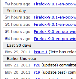 Mal ein Beispiel an einem schlechten 3rd part build :) Es geht aber nicht um irgendwelche Builds, sondern die Seite an sich. Es wird nämlich ganz links das Aufklapp-"+"-Zeichen über die Stunden (hours ago) gemalt, falls sie mehr als Einstellig sind. http://code.google.com/p/pcxfirefox/updates/list