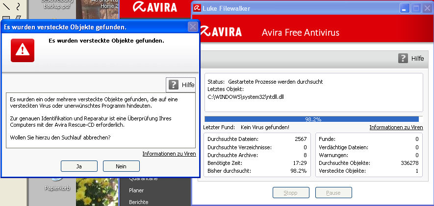 ich habe gerade einen Scan durchgeführt und erhalte diese Fehlermeldung. Ich habe Avira Free Antivirus (ohne CD).