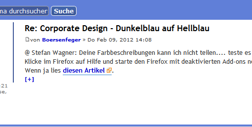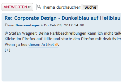 Das führt dann zu schlecht lesbaren Seiten wie hier im Forum, wo es dunkelblau auf Hellblau zugeht, oder auf der Hilfeseite Mozillas, wo Dunkelgraue Schrift auf Hellgrauem Grund einem das Lesen verleidet.