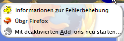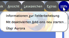 z.B. auch dieser:Code#subscribeToPageMenupopup,menuitem[label="Diese Seite abonnieren"] { display:none!important} #bookmarksMenuItemsSeparator, #organizeBookmarksSeparator, #bookmarksToolbarSeparator{ display:none}und Erweiterungen... z.B. MenuEditor Damit habe ich viele Einträge in vielen Menüs ausgeblendet. Mag jetzt aber nicht testen, ob die daran schuld ist. Zur Not verzichte ich lieber auf die gewünschte Anzeige... Danke für deine Mühe!