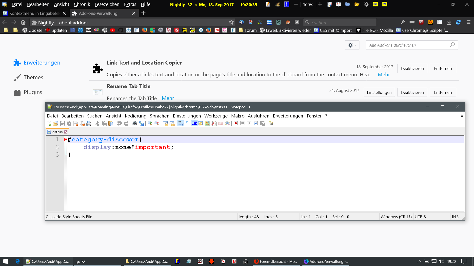 Ist der Code vielleicht in der userChrome.css gelandet? -