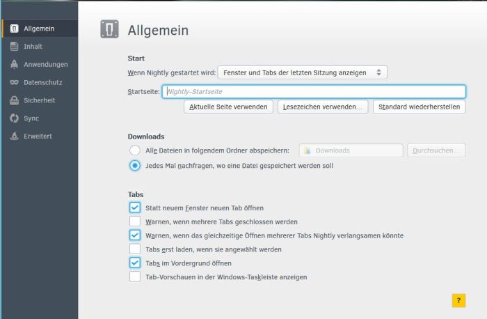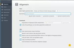 ab Firefox 31 werden die Einstellungen nicht mehr in einem TAB sondern in einem Fenster dargestellt.